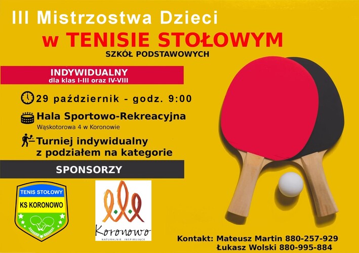 Klub Sportowy Koronowo zaprasza do udziału w III Mistrzostwach Dzieci w Tenisie Stołowym szkół podstawowych.
