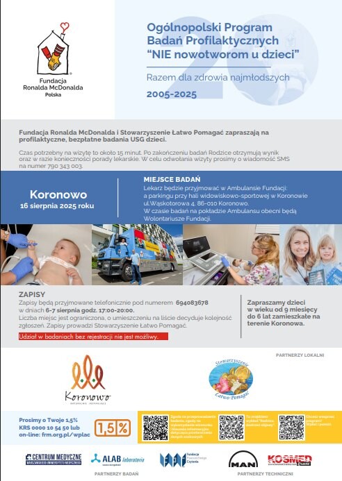 Już 16 sierpnia 2025 rokuFundacja Ronalda McDonalda we współpracy ze Stowarzyszeniem Łatwo Pomagać oraz Gminą Koronowo zaprasza na profilaktyczne oraz kompleksowe badania USG dzieci w wieku od 9 miesięcy do 6 lat, które mieszkają na terenie gminy Koronowo.