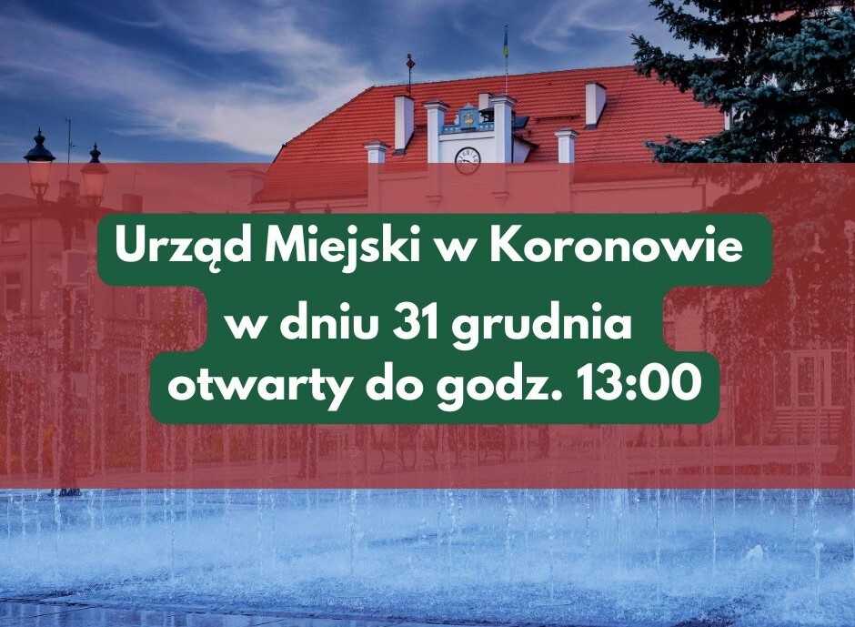Uprzejmie informujemy, że 31 grudnia 2025 r. Urząd Miejski w Koronowie otwarty będzie w godzinach 7:30 - 13:00.