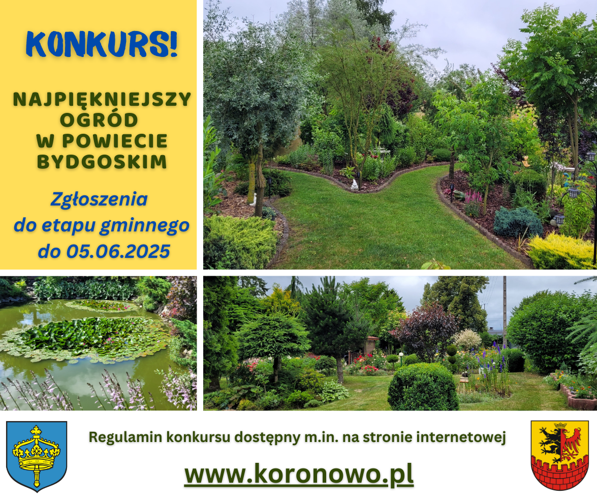 Starostwo Powiatowe w Bydgoszczy, wzorem lat ubiegłych, organizuje XXVI edycję konkursu „Najpiękniejszy Ogród w Powiecie Bydgoskim”. Zachęcamy mieszkańców gminy Koronowo do wzięcia udziału w konkursie. Na laureatów czekają nagrody!