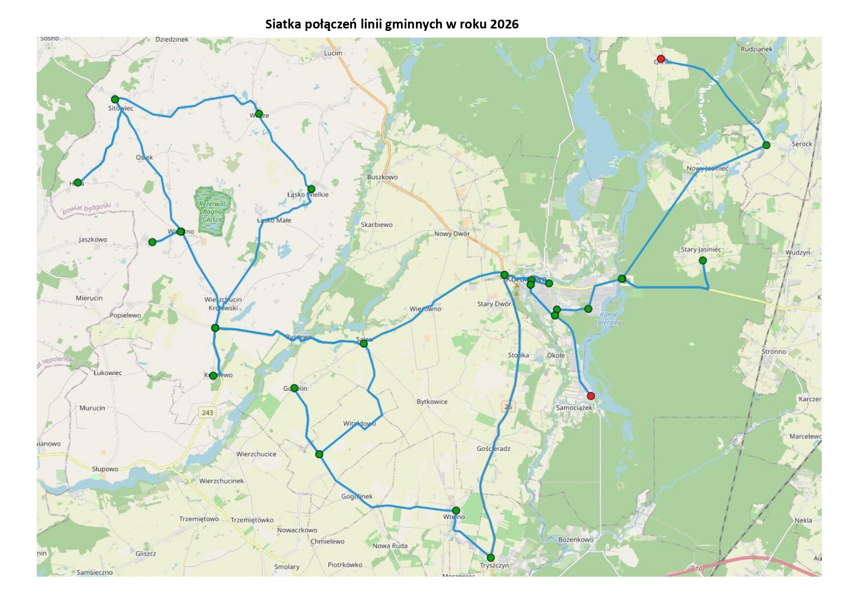 W roku 2026 Gmina Koronowo ponownie uruchamia trzy linie autobusowe: