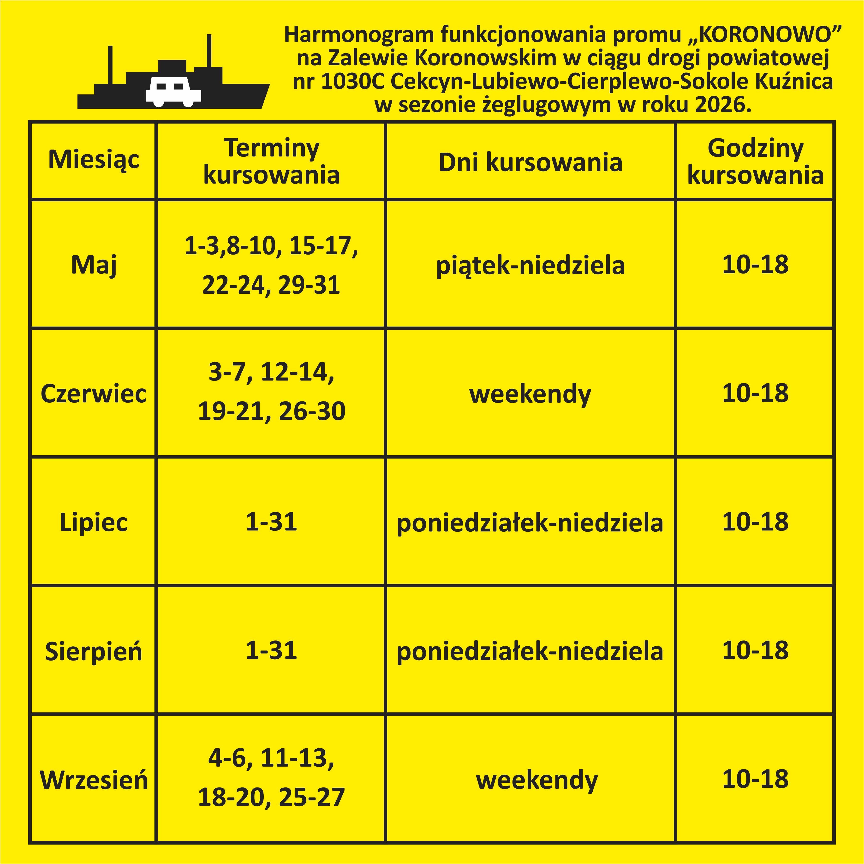 Harmonogram funkcjonowania promu "KORONOWO" na Zalewie Koronowskim w ciągu drogi powiatowej nr 1030C Cekcyn-Lubiewo-Cierplewo-Sokole Kuźnica w sezonie żeglugowym w roku 2026.