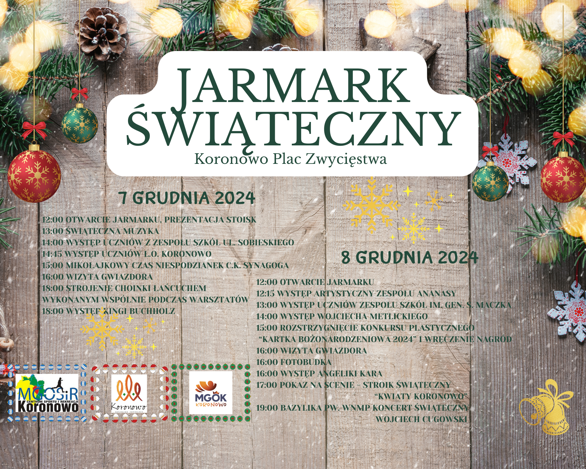 Zachęcamy do udziału w Jarmarku Świątecznym, który odbędzie się w dniach 7 - 8 grudnia 2024 r. w Koronowie.