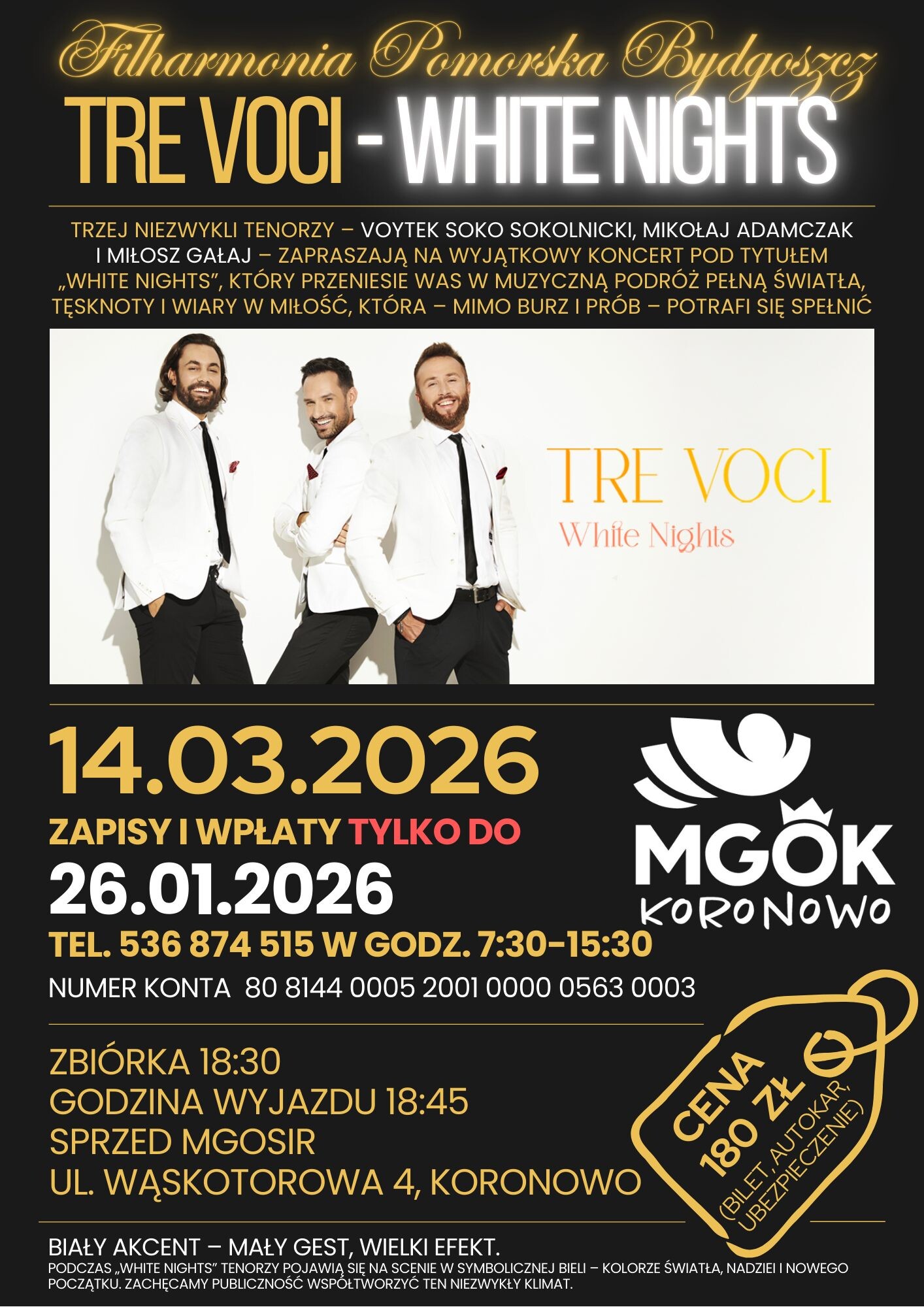 Miejsko - Gminny Ośrodek Kultury w Koronowie zaprasza na White Nights z TRE VOCI w diu 14 marca 2026 r.