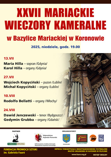 Zadanie publiczne pn. "XXVII Mariackie Wieczory Kameralne w Bazylice Mariackiej w Koronowie" jest współfinansowane przez Gminę Koronowo.