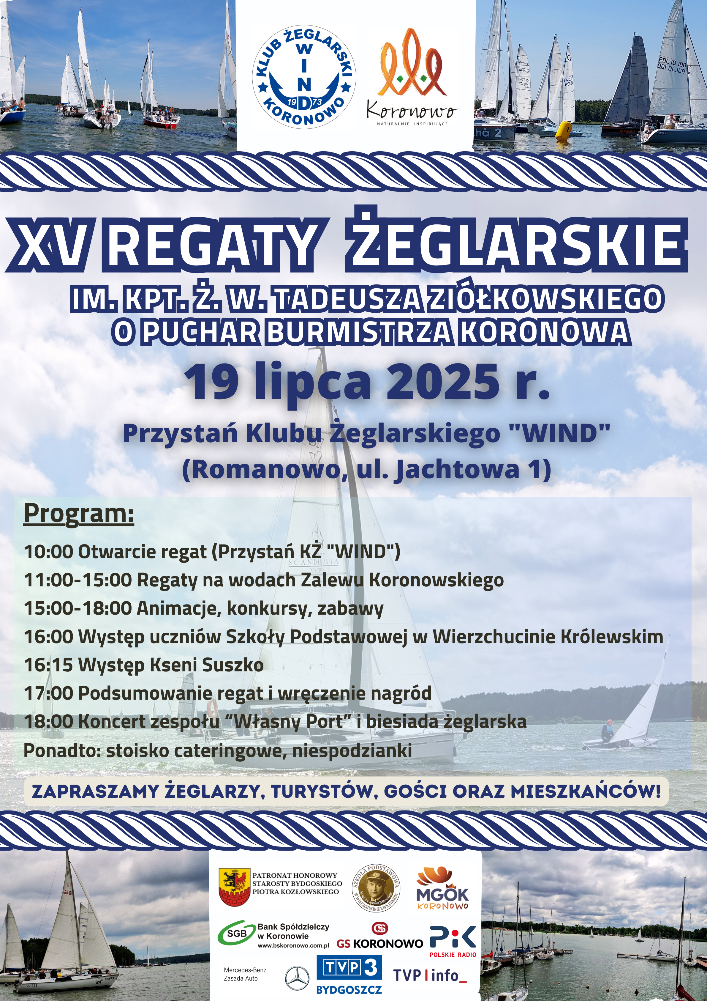 Zachęcamy do udziału w jubileuszowych, XV Regatach Żeglarskich im. kpt. ż. w. Tadeusza Ziółkowskiego o Puchar Burmistrza Koronowa, które odbędą się 19 lipca 2025 r. na wodach Zalewu Koronowskiego.