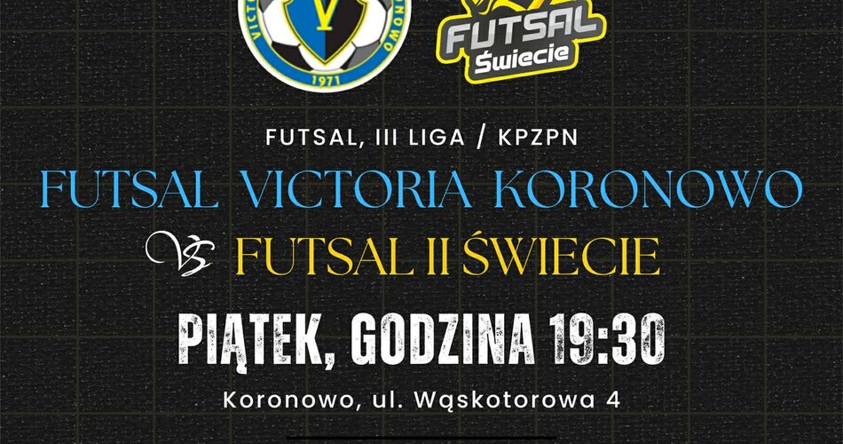 Drużyna Futsalowa Victoria Koronowo w dniu 12 grudnia br. rozegra swój pierwszy mecz w roli gospodarza. Zapraszamy wszystkich kibiców do hali sportowej MGOSiR Koronowo. Start godz. 19:30.