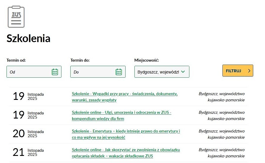 Zakład Ubezpieczeń Społecznych w Bydgoszczy zaprasza na bezpłatne szkolenia stacjonarne, które odbędą się w listopadzie br. w siedzibie oddziału przy ul. Św. Trójcy 33.