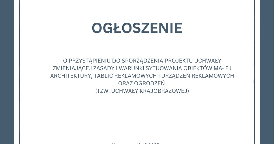 Burmistrz Koronowa, na podstawie art. 37b ust. 2 pkt 1 ustawy z dnia 27 marca 2003 r. o planowaniu i zagospodarowaniu przestrzennym (Dz.U. z 2024 r. poz. 1130 ze zm.) informuje, że w dniu 30 września 2025 r. Rada Miejska w Koronowie podjęła Uchwałę Nr XX/197/25 o przystąpieniu do sporządzenia projektu uchwały zmieniającej uchwałę krajobrazową