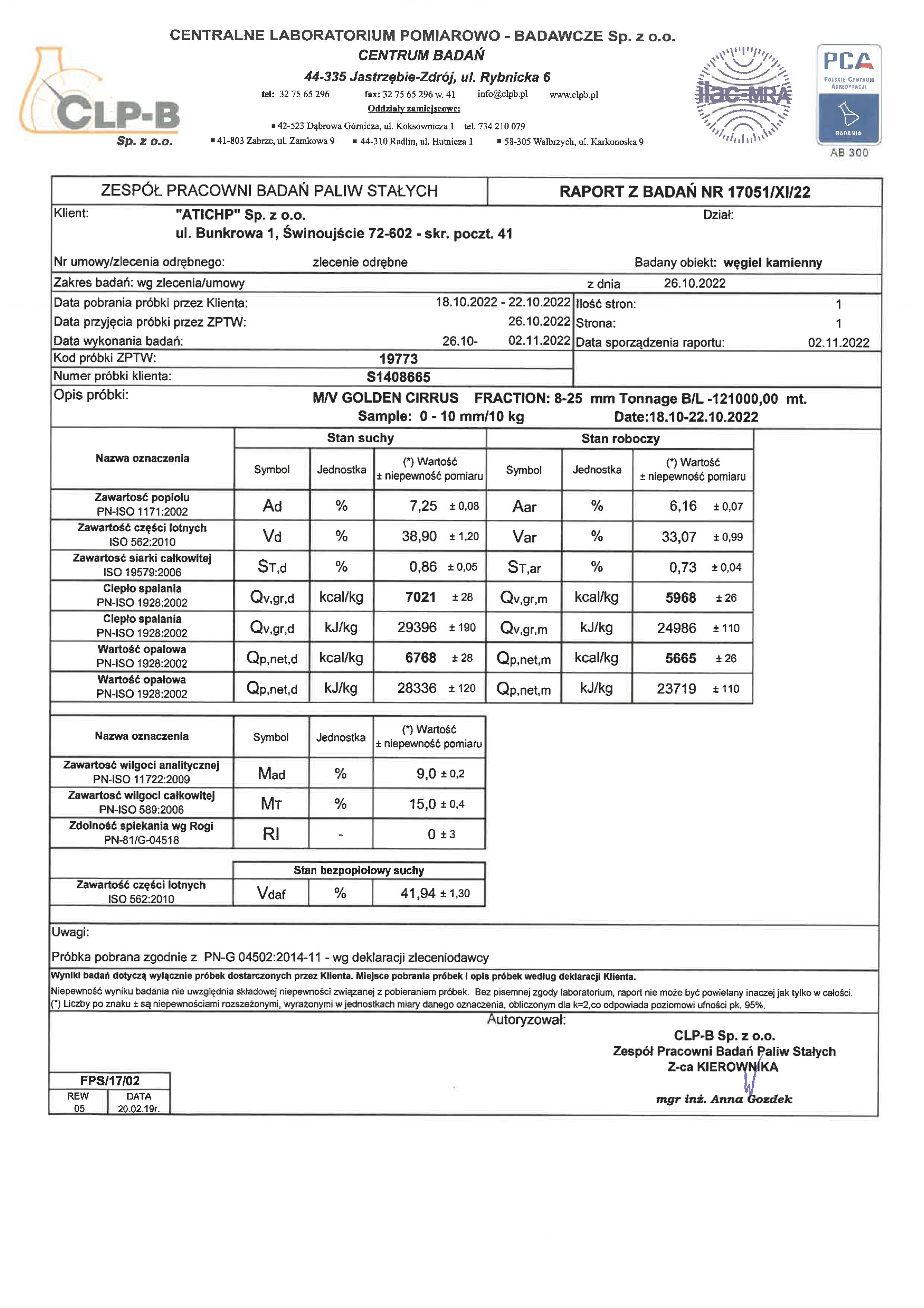 W ofercie dostępny będzie węgiel o parametrach potwierdzonych certyfikatami, które otrzymaliśmy od podmiotu wprowadzającego węgiel do obrotu.