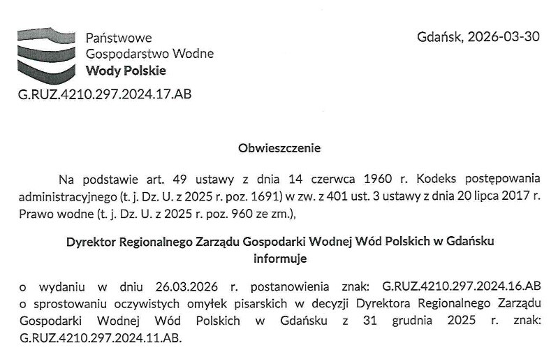 W związku z wydaniem w dniu 26.03.2026 r. postanowienia znak: G.RUZ.4210.297.2024.16.AB o sprostowaniu oczywistych omyłek pisarskich w decyzji Dyrektora Regionalnego Zarządu Gospodarki Wodnej Wód Polskich w Gdańsku z 31 grudnia 2025 r. znak: G.RUZ.4210.297.2024.11.AB, Burmistrz Koronowa zamieszcza Obwieszczenie.