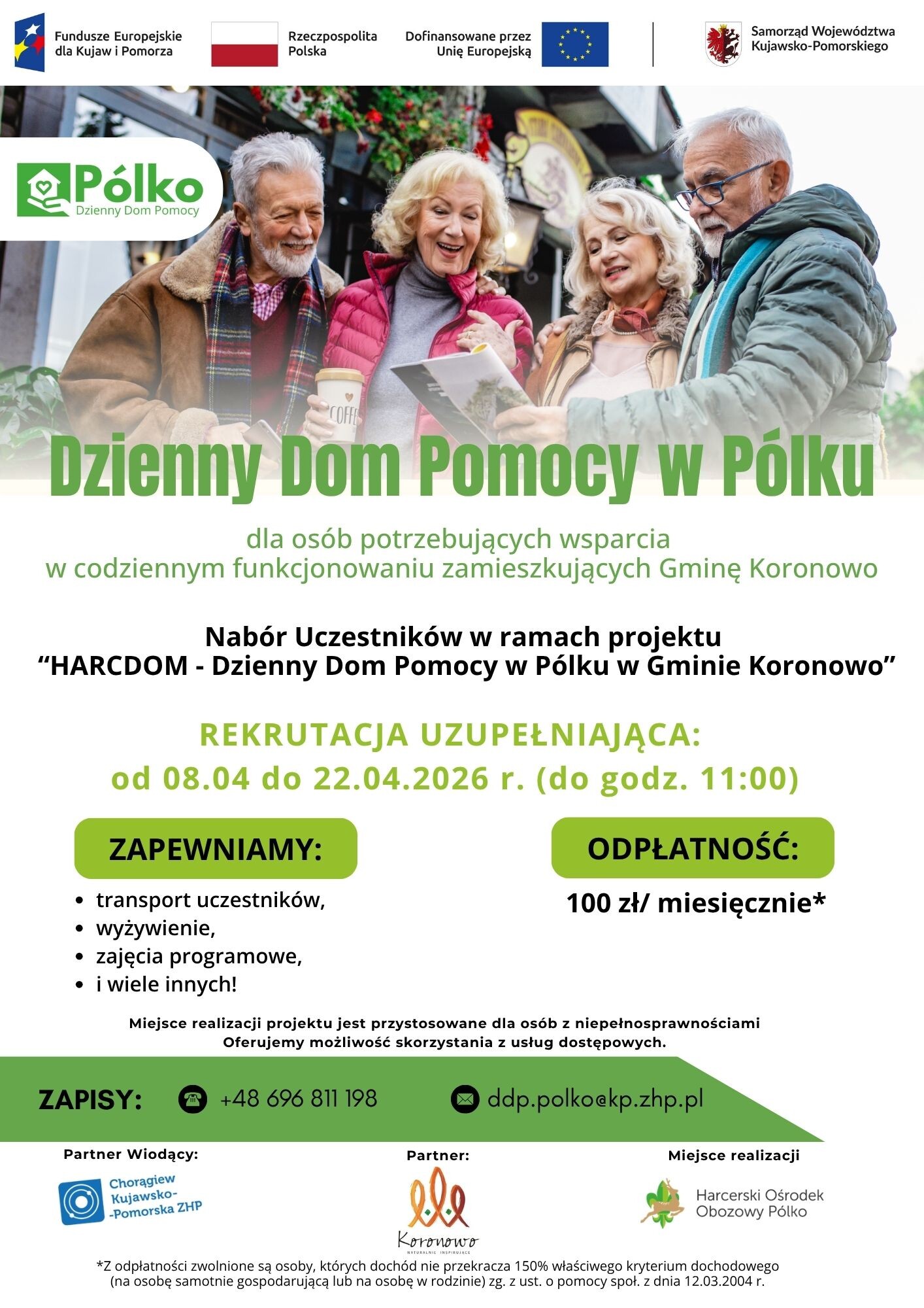 Informujemy o rozpoczęciu rekrutacji uzupełniającej do Dziennego Domu pomocy w Pólku realizowanego w ramach projektu „HARCDOM – dzienny dom pomocy w Pólku w Gminie Koronowo”. Projekt jest współfinansowany z Programu Regionalnego Fundusze Europejskie dla Kujaw i Pomorza 2021-2027, Priorytet: 8 Fundusze europejskie na wsparcie w obszarze rynku pracy, edukacji i włączenia społecznego, Działanie: 08.24 Usługi społeczne i zdrowotne. Schematu: Rozwój usług opiekuńczych w dziennych domach pomocy. Partnerem projektu jest Gmina Koronowo. Rekrutacja uzupełniająca trwa od 08.04. do 22.04.2026 r. (do godz. 11:00)