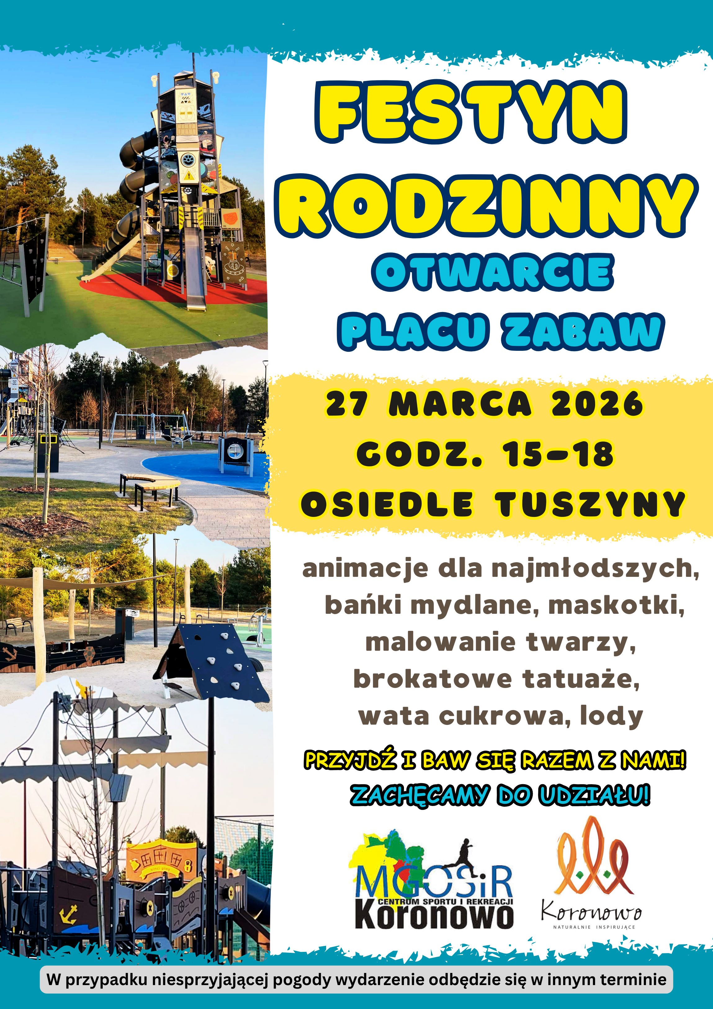 Zapraszamy na Festyn Rodzinny połączony z otwarciem placu zabaw na osiedlu Tuszyny, który odbędzie się 27 marca 2026 r. w godzinach 15 - 18.