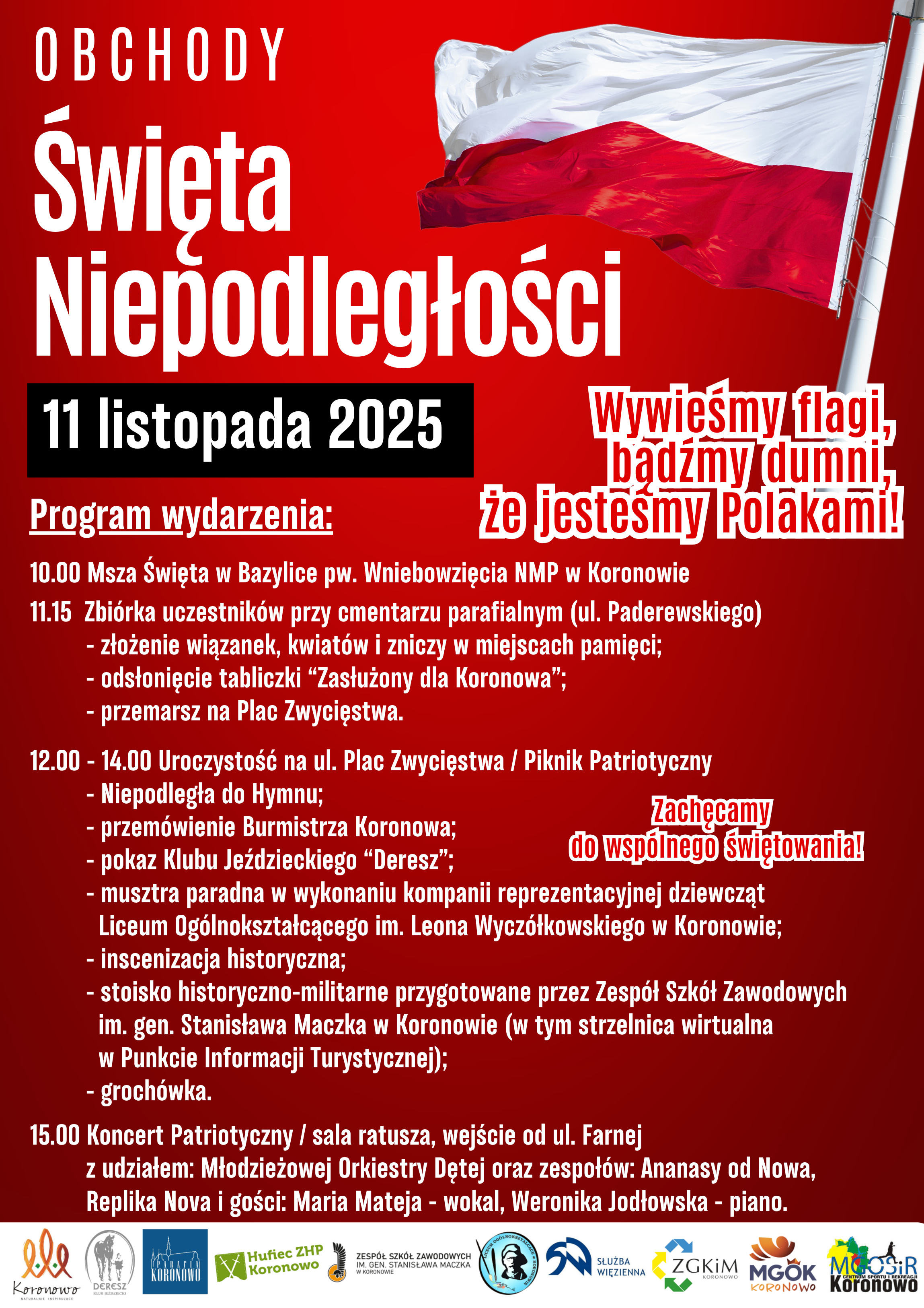 Serdecznie zapraszamy na Obchody Święta Niepodległości, które odbędą się 11 listopada 2025 r. w Koronowie.