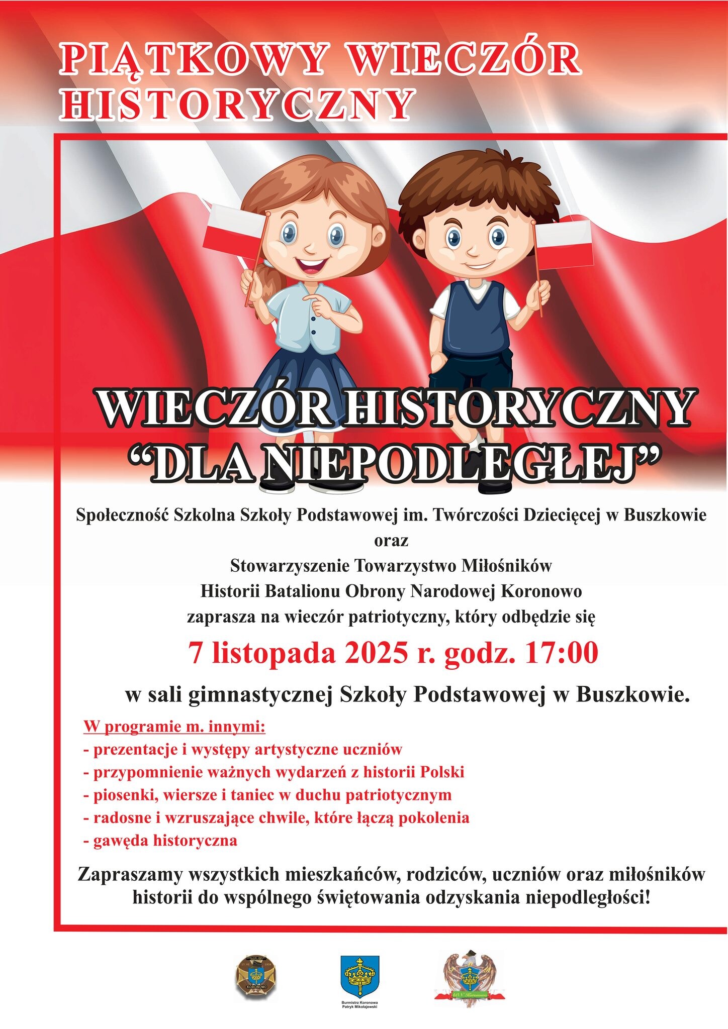 zapraszają na wieczór patriotyczny, który odbędzie się 7 listopada 2025 r. o godz. 17:00 w sali gimnastycznej szkoły.