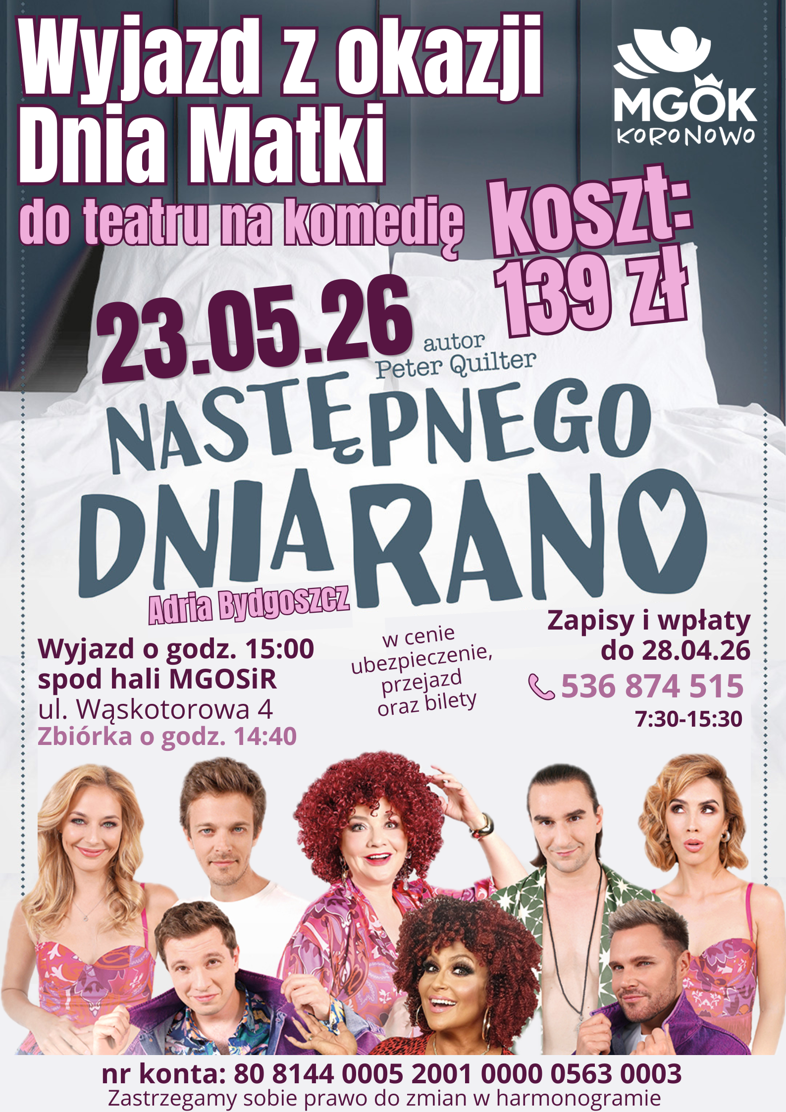 Miejsko - Gminny Ośrodek Kultury w Koronowie zaprasza na wyjazd z okazji Dnia Mamy, który odbędzie się 23 maja 2026 r.