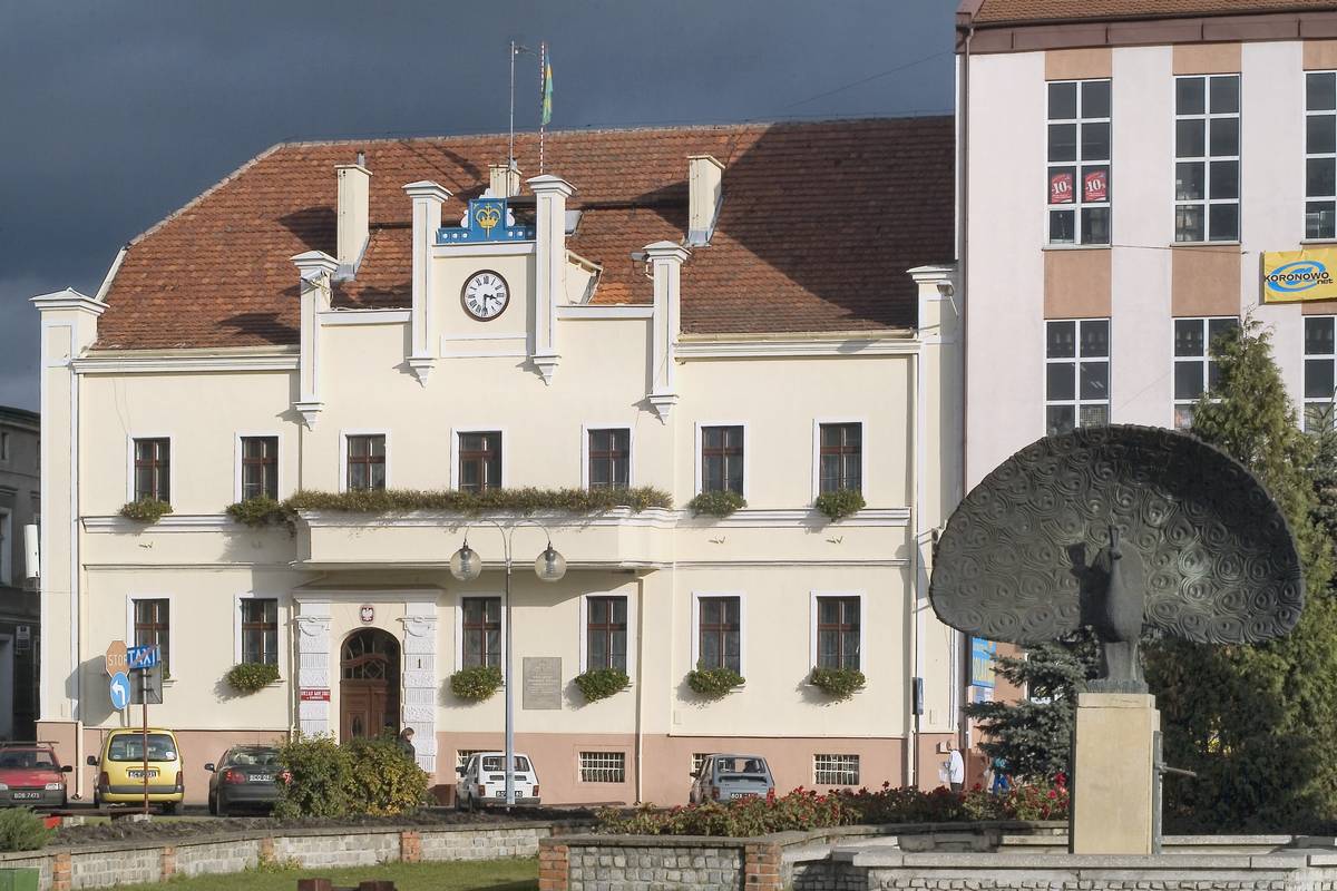 Zaprojektowany w stylu późno klasycystycznym, wzniesiony w pierwszej połowie XIX wieku. Przebudowany i rozbudowany w 1913 roku. Na siedmioosiowej elewacji znajduje się wejście usytuowane po lewej stronie, ujęte boniowanymi pilastrami. Ratusz pokryty jest dwuspadowym dachem z naczółkami , nakryty czerwoną dachówką. Na osi fasady głównej znajduje się nadwieszony, ozdobiony neogotyckimi wieżyczkami, niewielki szczyt z zegarem i herbem miasta. Pod znaczną częścią ratusza znajdują się pierwotne,pochodzenia gotyckiego piwnice sklepione kolebkowo.